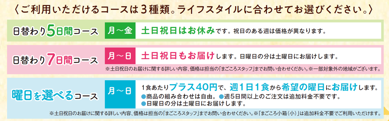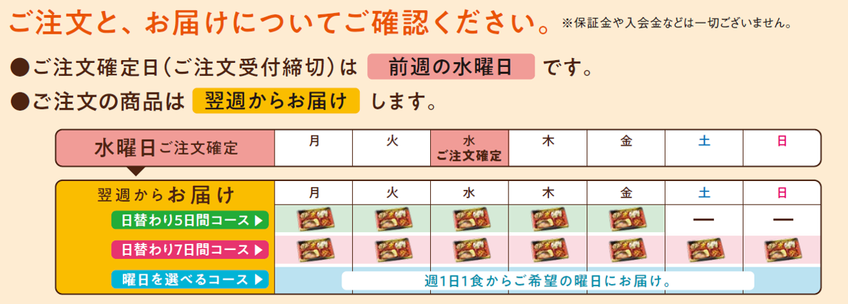 バランスのとれた日替わりのお食事をお届けします。●毎週水曜日ご注文締切➡翌週お届け ●別途宅配料はかかりません。